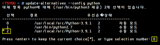 | # update-alternatives --config python \\ 현재 등록된 python 확인 # update-alternatives --remove python [등록된 python] \\ python 삭제 ex) # update-alternatives --remove python /etc/alternatives/python # update-alternatives --remove python /usr/bin/python3.5 # update-alternatives --remove python /usr/local/bin/python3.9 |