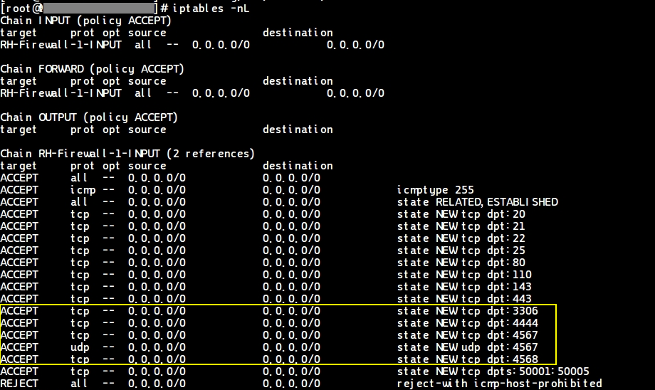 | -A RH-Firewall-1-INPUT -p tcp -m state --state NEW -m tcp --dport 3306 -j ACCEPT -A RH-Firewall-1-INPUT -p tcp -m state --state NEW -m tcp --dport 4444 -j ACCEPT -A RH-Firewall-1-INPUT -p tcp -m state --state NEW -m tcp --dport 4567 -j ACCEPT -A RH-Firewall-1-INPUT -p udp -m state --state NEW -m udp --dport 4567 -j ACCEPT -A RH-Firewall-1-INPUT -p tcp -m state --state NEW -m tcp --dport 4568 -j ACCEPT |