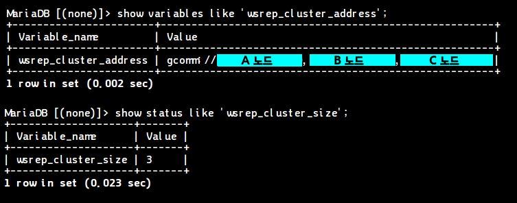 | galera cluster 에 연동된 IP 주소나 도메인 출력 > show variables like 'wsrep_cluster_address'; cluster의 노드 갯수 확인 > show status like 'wsrep_cluster_size'; |