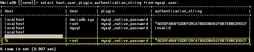 | > GRANT ALL PRIVILEGES ON *.* TO 'root'@'%' IDENTIFIED BY '패스워드'; > flush privileges; |