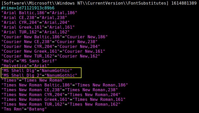 | # vi ~/.wine/system.reg "MS Shell Dlg" = "[설치폰트]" "MS Shell Dlg 2" = "[설치폰트]" ![]() |