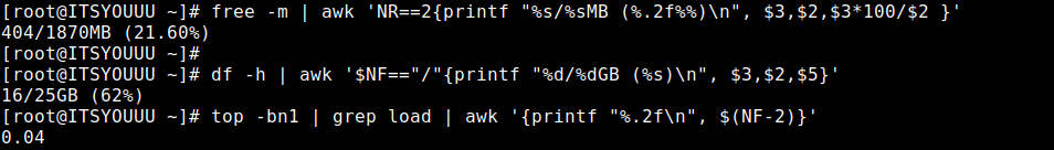 | # free -m | awk 'NR==2{printf "%s/%sMB (%.2f%%)\n", $3,$2,$3*100/$2 }' |